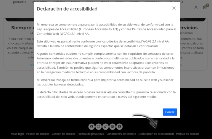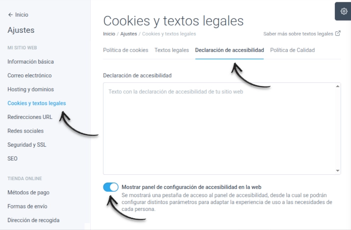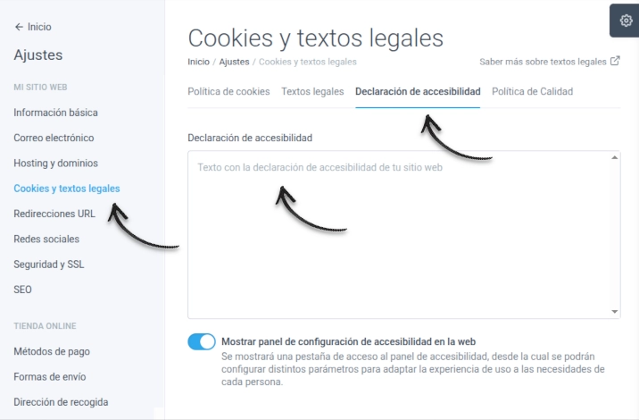 Si quieres añadir la declaración de accesibilidad en tu página web, accede al panel de control, entra en Ajustes > Cookies y textos legales y, dentro de la pestaña Accesibilidad web, completa el campo “Declaración de accesibilidad”. Automáticamente se añadirá un enlace en el pie de página de tu web con el texto “Declaración de accesibilidad”. Al hacer clic en este enlace, se mostrará un popup con el contenido de la declaración, permitiendo su consulta de forma rápida y accesible.